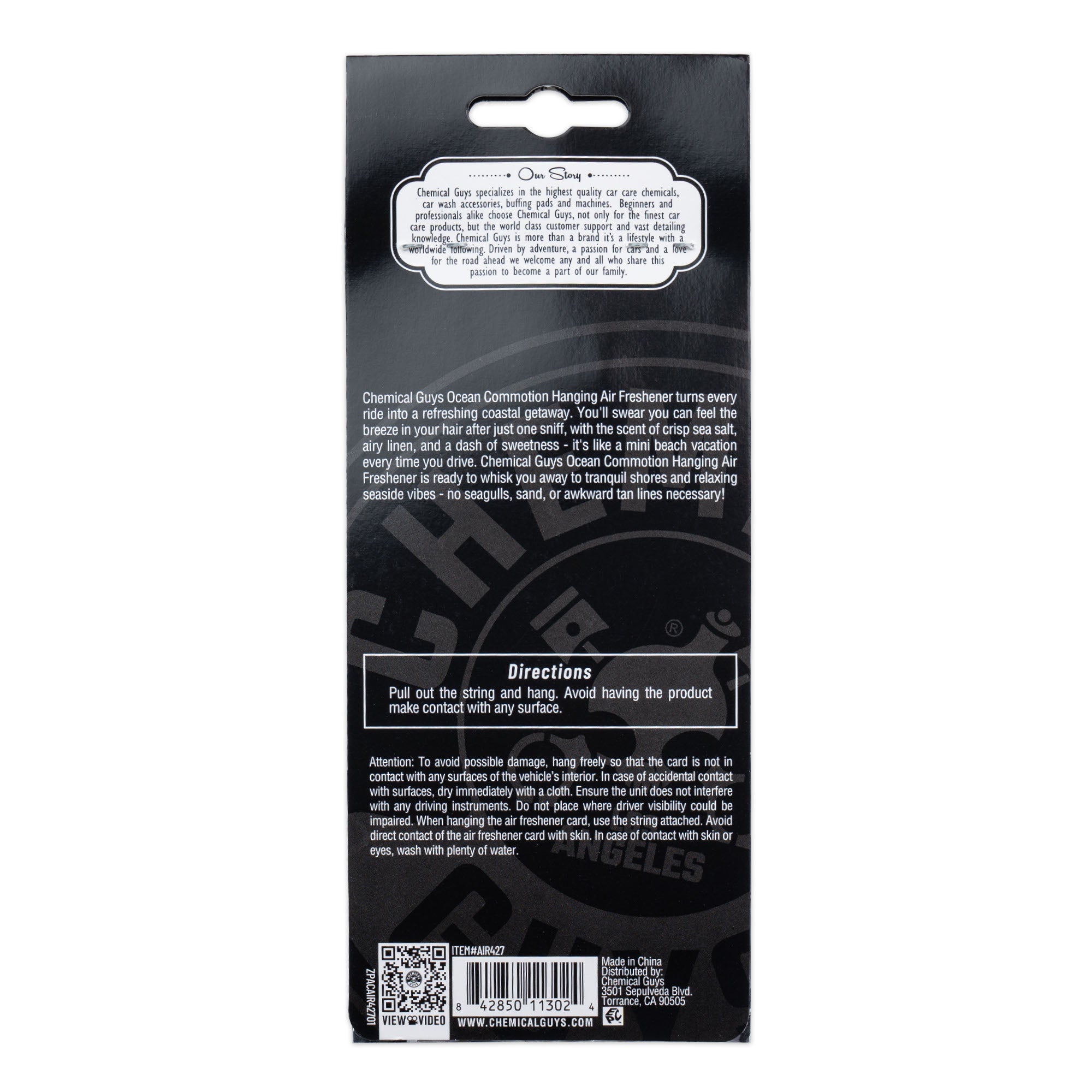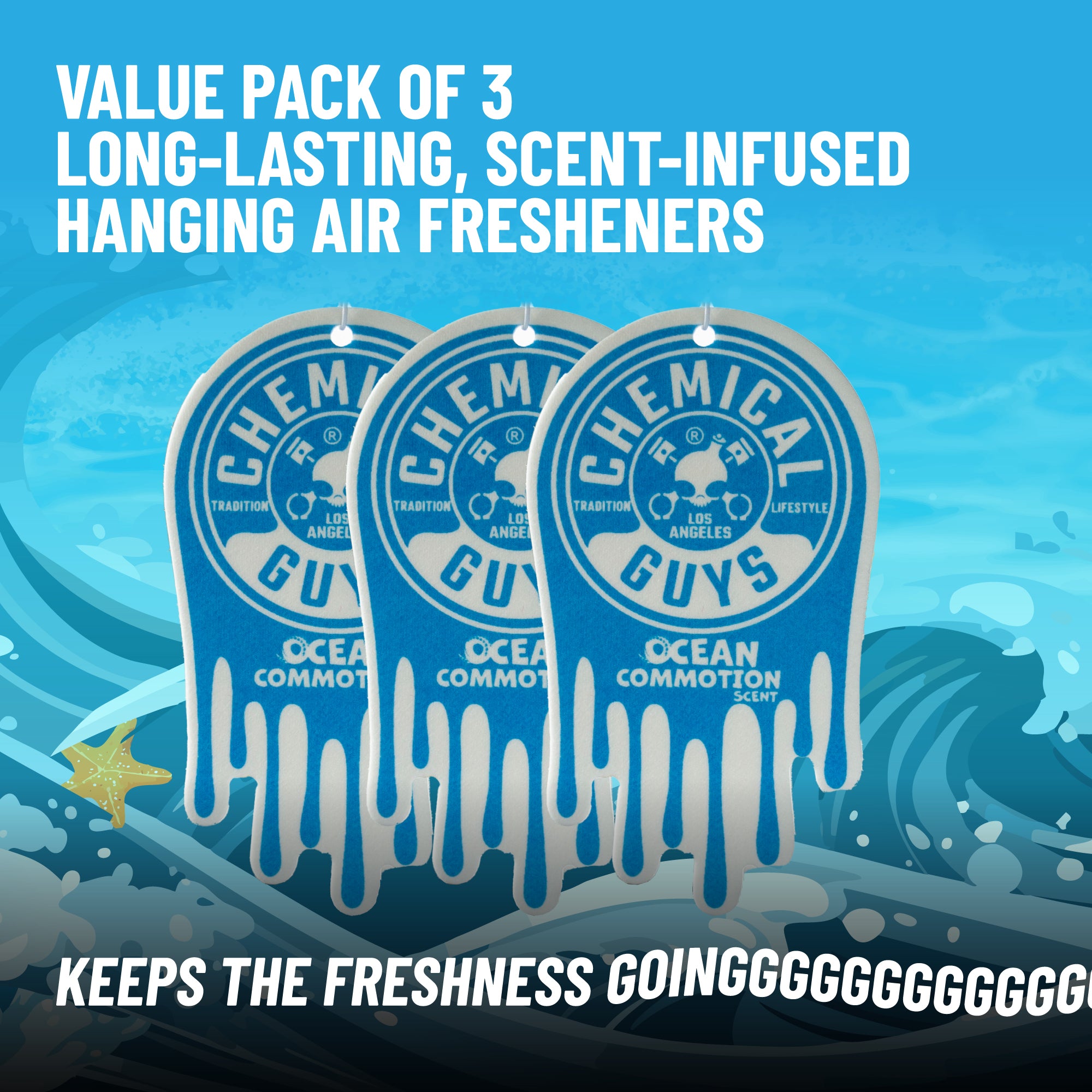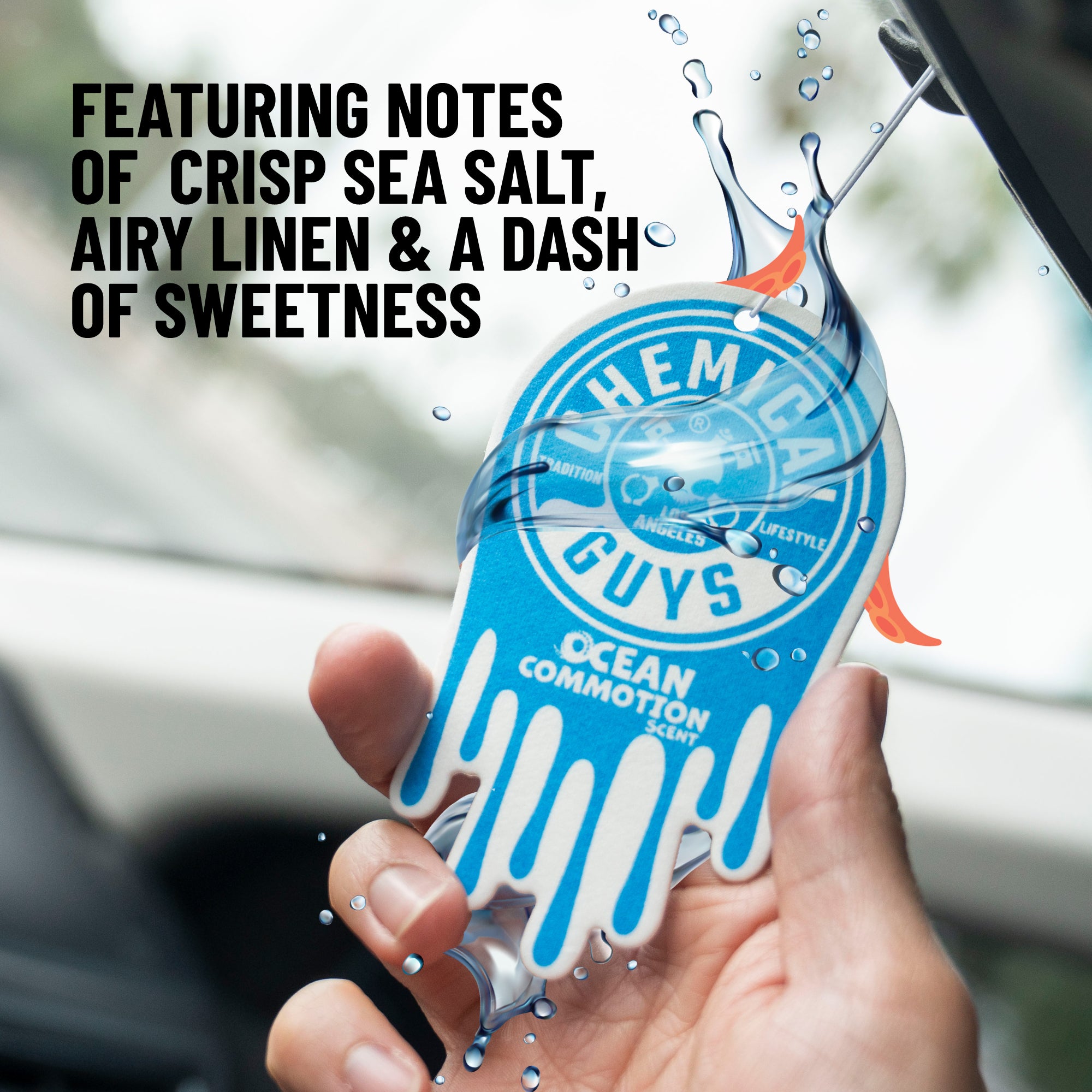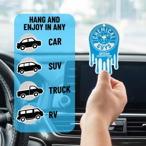 Chemical Guys Ocean Commotion Air Freshener turns every ride into a refreshing coastal getaway with the scent of crisp sea salt. airy linen. and a dash of sweetness ?C it’s like a mini beach vacation every time you drive.?