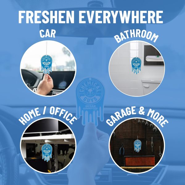 Chemical Guys Ocean Commotion Air Freshener turns every ride into a refreshing coastal getaway with the scent of crisp sea salt. airy linen. and a dash of sweetness ?C it’s like a mini beach vacation every time you drive.?
