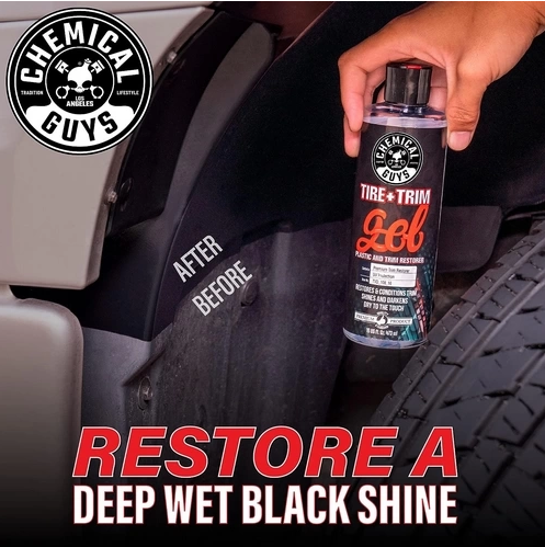 Tire + Trim restores faded trim and tires with a factory-fresh. wet-black shine while protecting against dirt. water. and harmful UV rays. Apply this gel formula with a foam applicator.
