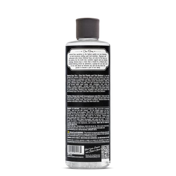 Tire + Trim restores faded trim and tires with a factory-fresh. wet-black shine while protecting against dirt. water. and harmful UV rays. Apply this gel formula with a foam applicator.